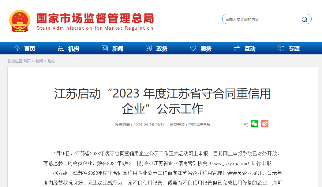 江苏启动2023 年度江苏省守合同重信用企业公示工作
