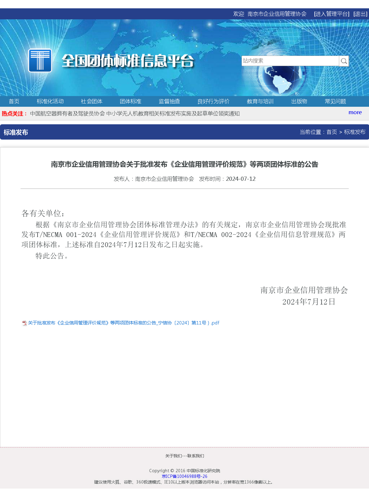 根据《南京市企业信用管理协会团体标准管理办法》的有关规定,南京市企业信用管理协会现批准发布T/NECMA 001-2024《企业信用管理评价规范》和T/NECMA 002-2024《企业信用信息管理规范》两项团体标准,上述标准自2024年7月12日发布之日起实施。